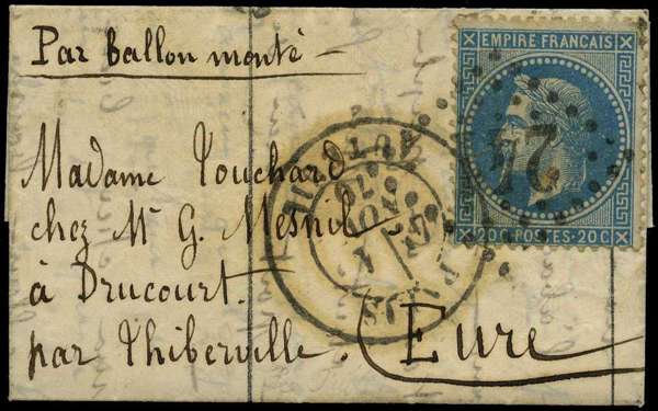 Twenty-second Balloon of the Siege: 1870 much-folded printed Ballon Monte lettersheet to Thiberville, franked by Napoleon III 20c Empire well tied by Star mark with Paris Auteuil cds for 1 Nov, carried on the Balloon 'La Fulton' which departed Paris on 2 Nove, backstamped by Paris Cherbourg rail route mark and Thiberville arrival mark dated 4 Nov, an attractive little item.