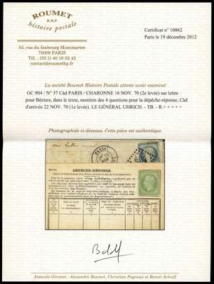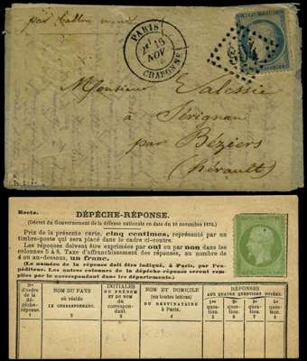 Thirtieth Balloon of the Siege: 1870 envelope to Beziers, South of France franked by Ceres 20c Republic well tied by 904 numeral with Paris Charonne cds for 16 Nov, with reply card with Napoleon III 5c adhesive applied, carried on the Balloon 'General Uhrich' which departed Paris on 18 Nov, backstamped with Beziers arrival mark for 23 Nov; cover a little fragile (due to the use of such a thin paper), still a fine and scarce pairing. Roumet Certificate (2012)