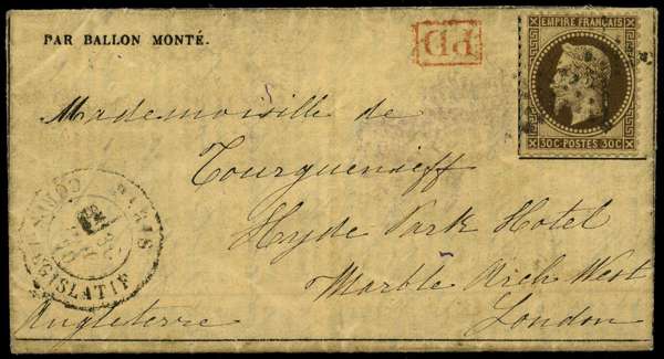Thirty-fifth Balloon of the Siege: 1870 printed Gazette des Absents (edition 12) lettersheet sent to London, franked by Napoleon III 30c Empire, tied by Star mark with Paris Corps Legislatif cds for 30 Nov, carried on the Balloon 'Jules Favre No. II' which departed Paris on 30 Nov, backstamped with Calais transit and London arrival mark for DE 6, fine.