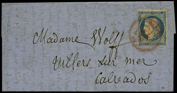 Forty-eighth Balloon of the Siege: 1870 entire letter to Calvados franked by Ceres 20c Republic tied by red official cds dated 22 Dec, carried on the Balloon 'Deliverance' which departed Paris on 23 Dec, backstamped with Caen A Paris transit mark and Villers-Sur-Mer arrival mark for 29 Dec, central filing fold, otherwise fine.