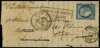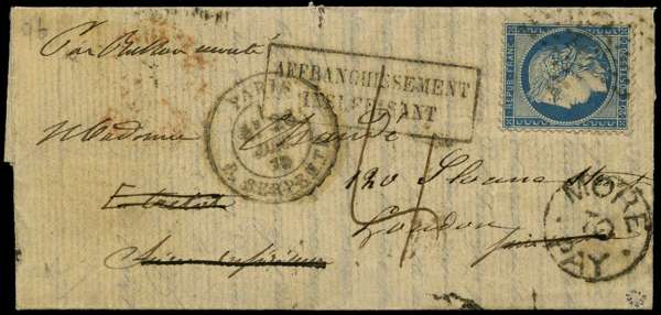 Fiftieth Balloon of the Siege: 1870 entire letter re-addressed to London and bearing Ceres 20c Republic, (under paying the overseas rate) tied by Star mark with Paris Rue Serpente cds for 26 Dec, and carried on the Balloon 'Tourville' which departed Paris on 27 Dec, handstamped 'Affranchissement Insuffisant' with More to Pay at lower right and charged 4d in manuscript on arrival, backstamped with Shipletter London and London arrival marks for JA 6, very fine. An attractive item.