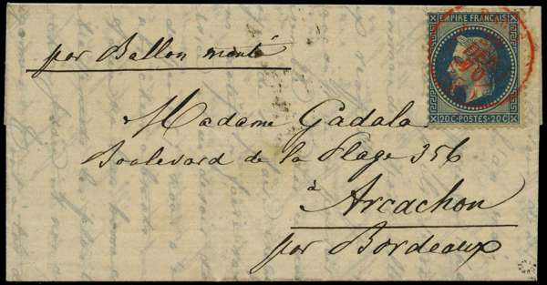Fifty-second Balloon of the Siege: 1870 entire letter to Madam Gadala, Arcachon, par Bordeaux, franked by Napoleon III 20c Empire, neatly struck by red official cds for 28 Dec, carried by the Balloon 'Bayard' which departed Paris on 29 Dec, backstamped with Arcachon arrival marks for 31 Dec, most fine and attractive, offered with English translation of contents.