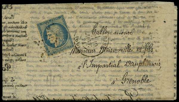 Sixty-third Balloon of the Siege: 1871 printed 'Correspondence Havas' lettersheet to Grenoble, franked by Ceres 20c Republic tied by Star mark with Paris (60) cds for 19 Jan, carried by the Balloon 'General Bourbaki' which departed Paris on the 20 Jan, backstamped by Grenoble arrival mark for 31 Jan, central filing fold, affecting adhesive, still an interesting item