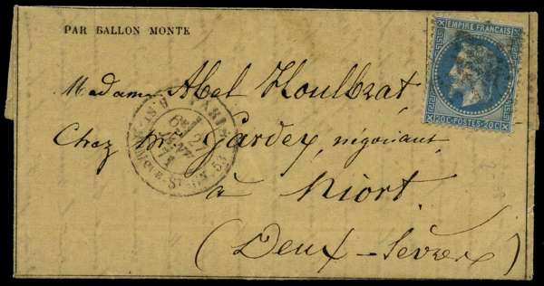 Sixty-seventh and Last Balloon of the Siege: 1871 printed Gazette des Absents (edition 32) lettersheet to Niort, franked by Napoleon III 20c Empire, tied by Star mark with Paris Rue St. Dominique cds for 27 Jan (day before the surrender!), carried on the Balloon 'General Cambronne' which departed Paris on 28 Jan hours before the armistice, backstamped with Niort datestamp for 2 Feb, slight wear to opening otherwise very fine, offered with English translation of the original contents.