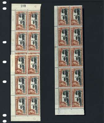 1942-51 small study of mint 2/- positional blocks with (or without) the major R1/3-4 top frame re-entries, unmounted (or hinged on selvedge only) unless stated. April 42 block of six, May 44 block of eight (one stamp lightly hinged), these two prior to re-entering, Feb 48 top two rows (centrally severed), April 49 block of ten, and late printing (Plate 2) block of four once again without the re-entries. SG 128b var.
