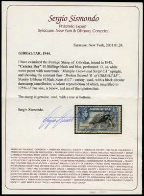 1951 printing of the 10/- with R9/4 broken 'R', CDS-used with a neatly-closed tear at the base. The only CDS-used example we have seen and likely comfortably the best-looking example of this rare variety. Sismondo Certificate (2001). SG 130ab, £3750
