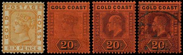 Mainly mint on leaves including 1875 6d, 1876 4d, 1884 to 1s, 1889 10s and 1894 20s, 1902 to 20s, 1904 to 2s6d, 1907 to 5s, 1913 values to 20s used plus later Ghana to 1977. Slightly mixed condition on earlies with many good to fine (hundreds)