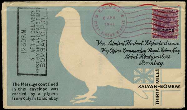 1941 (6 Apr), First Pigeon Post from Kalyan to Bombay, printed envelope showing silhouette of pigeon franked by 1932-36 1a3p mauve 'SERVICE' overprint tied by 'KALYAN /6 APR/1941/FIRST PIGEON MISSIVE' wavy-line machine cancel, sideways boxed Bombay G.P.O. same-day hs at left; envelope is sealed and will probably contained the issued booklet. Very fine