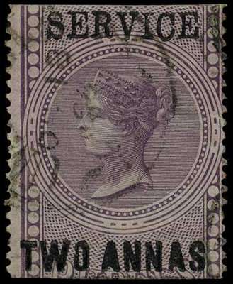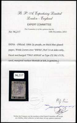 OFFICIAL: 1866 2a purple on thick blue glazed paper, surcharge type O2 ''SERVICE / TWO ANNAS'', lightly struck by Umritsur duplex dated 1866, minor marginal blemish, still fine for this stamp. BPA Certificate (2021) SG O15