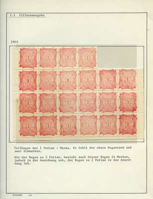 1903 1put. pink on thick white paper part sheet of 22, unused without gum, one stamp just touched by foxed spot; and 2put. deep violet on thick white paper sheet of 18 (6 x 3), fine, errant diagonal perfs in each of the top corners. The 2put. very scarce in sheet form. SG 18, 19
