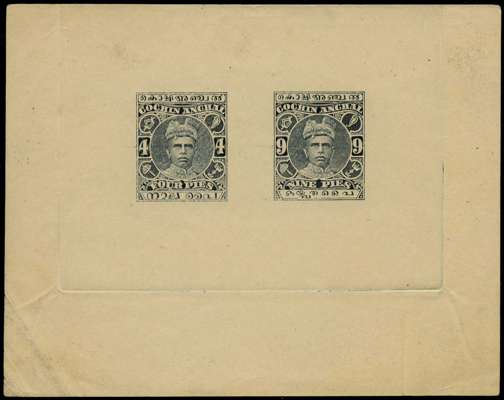 1911 composite Die Proof of the 4p and 9p denominations in very deep blackish blue on wove paper 128 x 100mm, showing die sinkage on three sides. Some wrinkles, outside the die-sunk area, rare and attractive; for SG 28-9