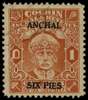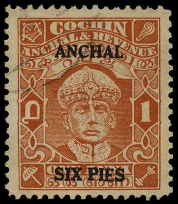 1942-4 1a brown-orange watermark Umbrella, surcharged ANCHAL/ SIX PIES Type 23, perf 13 x 13½. Very neatly used with perfs just a trifle uneven. SG 81, £325