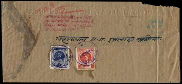 1942 ON DUNGARPUR STATE SERVICE ONLY cover bearing (on reverse) ½a Die I and 1a perf 10½, individually cancelled in violet. Some glue-staining, the envelope with some faults, still a good cover. SG 10, 11b