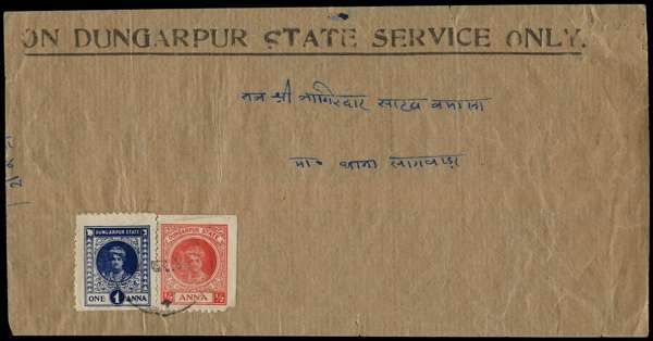 1947 ON DUNGARPUR STATE SERVICE ONLY cover bearing ½a Die III (missing lower right corner) and 1a perf 10 (few blunt perfs), neatly cancelled. SG 10d, 11c