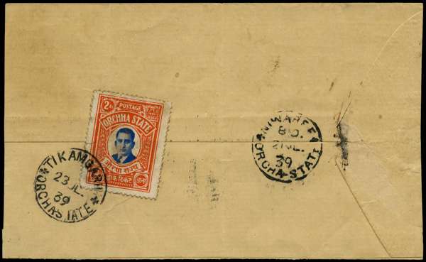 1939 envelope (reduced at left) bearing on the reverse 2a blue and red-orange. Sent from Niwaree with backstamp 21 JL 39, the stamp cancelled on arrival at Tikamgarh with 23 JL CDS. Vertical creases, one of which crosses the stamp, but a rather fine cover nonetheless, showing undoubted postal use. SG 14