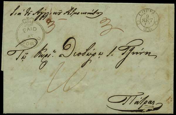 1844-61 entire with a good strike of the Corfu Crowned Circle in black at top left, and CDS of 9 SET at top right; a couple of filing creases, still fine and attractive. SG CC2, £650