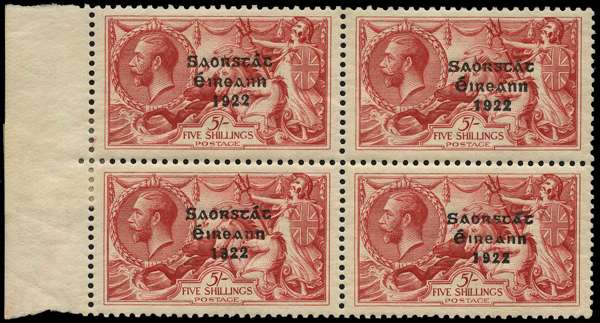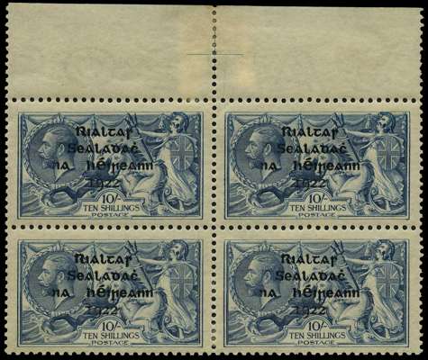 Valuable specialised collection, 1922 -1939 in green springback album including mint 1922 Dollard seahorses 2s6d (2), 5s and 10s, Thom blue-black overprint seahorses to 10s single set and top marginal blocks of 4, Irish Free State to 10s, 1922-34 to 1s including coil join strips of 4 of ½d and 1d, 1925-28 seahorses and wide date to 10s, 1935 re-engraved to 10s, ½d to 2d Harrison overprints in pairs one with long '1' varieties, 1927 5s vertical pair, wide and narrow date and commemoratives. Mint varieties include 1922 Provisionals ½d to 2d various broken letters/misplaced ovpts, 1d ovpt inverted, 2d orange Die 1 single and marginal pair with inverted ovpt, 1½d 'PENCF' variety in marginal block of 9, 1922 ½d 'Saorstat' accent omitted in marginal block of 4, ½d pair, block of 4 and 2 blocks of 6 with accent inserted by hand, 1d 3 examples of accent inserted by hand and 2 pairs with accent and 't' inserted, Thom 2½d and 4d blocks with accent missing, 2 x 2s6d, 5s blocks of 4 each with no accent plus assorted controls to 1s. Used includes Dollard set to 10s, 1922-23 set to 10s, 1925 Bradbury 10s x 2, wide date to 10s. Careful viewing recommended, mixed condition throughout, still many good to fine