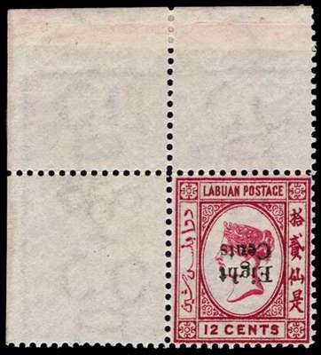 1881 (June) 8c on 12c carmine, type 5 surcharge, ERROR SURCHARGE INVERTED (with wmk inverted and reversed as always), upper left corner marginal, being pos. 1 on the sheet with the inverted surcharge from pos. 10 of the corrected first setting, brilliant o.g. (stamp unmounted) with the wmk clear in the margins from the face. A spectacular and wonderful stamp, absolutely superb and of the highest rarity, being one of just eight in private hands from the original Ferrary sheet of 10; the vertical pair from the right of the sheet (pos. 5/10) is in the Royal Collection. Ex Lahner (Spink 12 March 1997, lot 327) and Danson (Robson Lowe 30 June 1971, lot 2081).