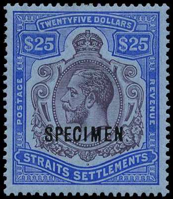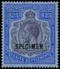 1912-23 Wmk MCA $25 purple and blue on blue, opt 'SPECIMEN', large part o.g; tiny gum fault, does not detract from its fine and fresh appearance. SG 213s