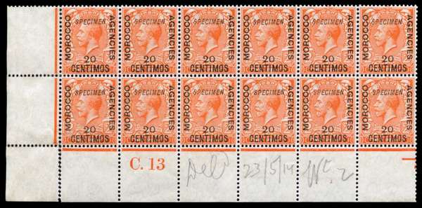 1914-26 Spanish Currency 20c on 2d orange, wmk Simple Cypher, opt 'SPECIMEN' (type GB23), lower left corner block of 12 (6x2) showing 'C. 13' control number, and annotated 'Deld 23/5/14 Wt.2' in pencil, unmounted o.g. Left margin slightly separated, still very fine and fresh. An important and highly desirable positional multiple, unique in private hands, and never previously on the market. Ex BPMA.