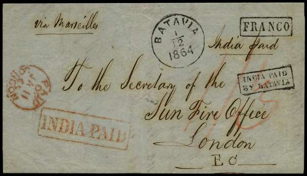 POSTAL HISTORY: 1864 (1 Dec) entire letter from Batavia to London, endorsed via Marseille and India Paid, with Batavia half round ds, framed 'INDIA PAID/BY BATAVIA', red framed 'INDIA PAID' and red London arrival (11.65). Fine and most attractive