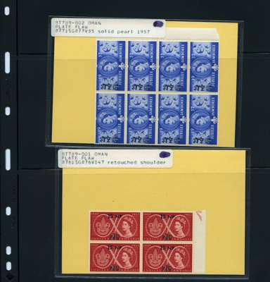 QEII selection of plate flaw varieties in positional mint blocks plus 1953 ½a,1a 1½a set of 3 x 20 sets in corner blocks of 10, unmounted o.g. (128)
