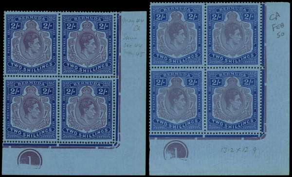 1944 (Mar.) 2/- perf 14 and 1950 (Feb.) 2/- perf 13 unmounted o.g. Plate blocks of four, each with pencilled dates annotated. Fine. SG 116d, e