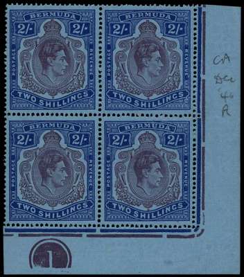 1946 (Dec.) 2/- perf 14 unmounted o.g. Plate block of four, with pencilled date on selvedge. Fine. SG 116d