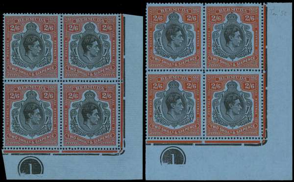 1948 (Jun.) 2/6d perf 14 o.g. Plate block of four with the lower stamps unmounted, and 2/6d perf 13 1951 (Nov.) perf 13 Plate block of four, fully unmounted o.g. SG 117b, c