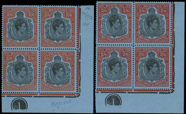 1951 (Nov.) 2/6d perf 13 Plate block of four, fully unmounted o.g., ex the SG reference collection with pencilled date; and the 1952 (Apr.) printing Plate block, o.g., lightly hinged on the selvedge only. SG 117b, c