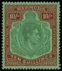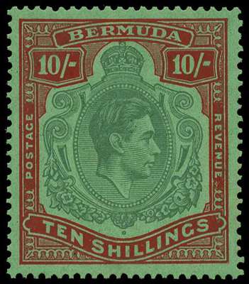 1939 10/- bluish green and deep red on green paper, unmounted o.g. with characteristic lightly-streaked gum, very fine. SG 119a, £200