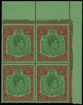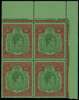1953 (Jan.) 10/- green and dull red on green paper top right corner block of four, fine unmounted o.g., flaws include HPF #12 broken leaf. SG 119f