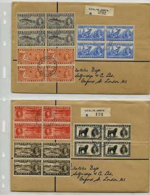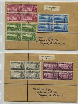 1937 'long' Coronation set in blocks of four on four registered Selfridge's covers with 1938 CDSs. The 3ct and 10ct comb perf. SG 257-267