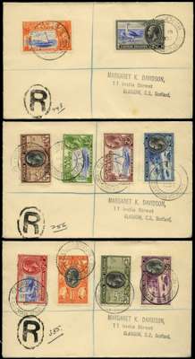 1937 trio of registered covers to Glasgow, Scotland franked by 1935 Pictorials part set to 2s ultramarine and black, tied by Georgetown Cayman Islands cds dated FE 19, 1937, fine and attractive. SG 96-105