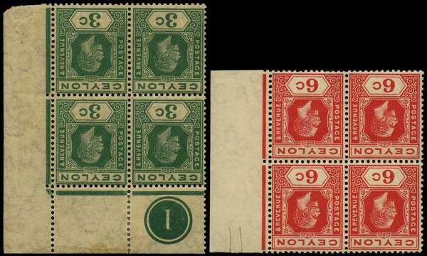 1912-25 selection of mint blocks of four with plate number "1" comprising 3c blue-green top right corner with watermark inverted and reversed, 6c pale scarlet right marginal watermark inverted (no plate number), 6c carmine lower marginal ; also 1921-32 3c watermark top right marginal block of six with plate number "1" watermark inverted; some with overall gum toning otherwise fine. SG 302y, 305w, 306, 339w