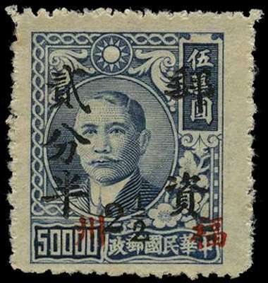 1949 Silver Yan 2½c on $50,000 slate-blue unused with additional two-character 'Foochow' control overprint. Fine. SG 1299 var, Chan S194