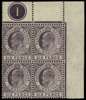 1908 6d dull purple and violet on chalk-surfaced paper, upper right corner Plate 1 block of four, large part o.g. with the upper pair unmounted. SG 60a