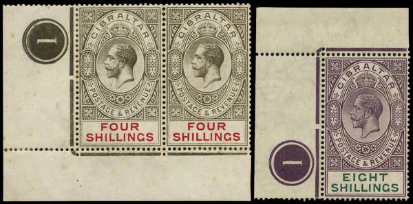 1912 4/- black and carmine lower left corner pair mint with Plate 1, full o.g., splitting between the stamps, foxing spots on reverse; and 8/- dull purple and green upper left corner example with Plate 1, stamp with full o.g., light foxing on reverse. SG 83-4, £180