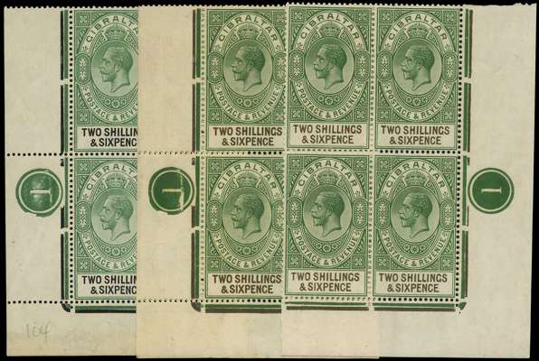 1925 2/6d green and black lower three bottom corner Plate 1 blocks of four, o.g. with eight out of the twelve stamps unmounted; contrasting shades, the two left blocks showing the Plate plugs in different states. Nice group. SG 104, £120