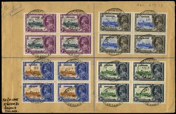 1935 Silver Jubilee set of four in blocks of four on registered FDC to Bristol, oval cancels. The 2d and 3d blocks show frame re-entries and the 6d and 1/- blocks plate scratches, written up on the page. One foxed spot just affects one 3d. SG 114-7, £192 as basic stamps
