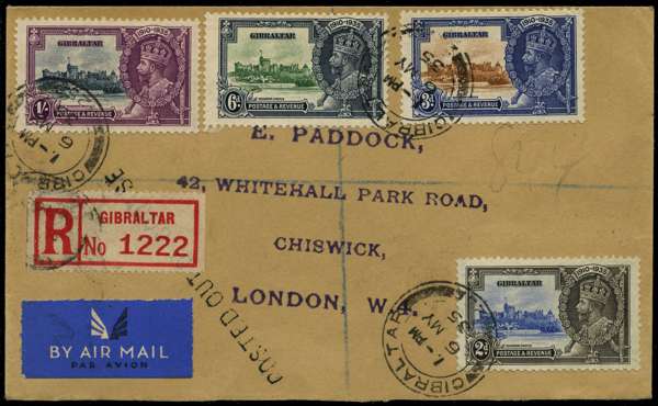 1935 Silver Jubilee set on registered airmail FDC to London, reg. label applied over straight-line POSTED OUT OF COURSE (i.e. cover placed in a postbox, rather than handed over the counter). Unusual. SG 114-7