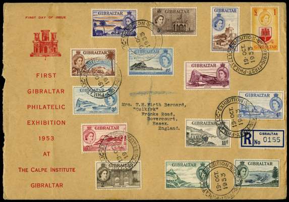 1953 definitive set on large illustrated FDC (10 x 7") produced as an FDC and as a commemorative envelope for the 1st Gibraltar Philatelic Exhibition, registered to Essex, with special Exhibition first day cancels. Tiny age spots just affect the 4d. SG 145-158