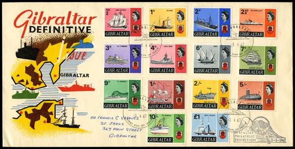 1967 set of 15 (no 1969 5d) on rather garish illustrated FDC, neatly locally addressed, with FDI cancels and Philatelic Exhibition handstamp. SG 200-213 less 205b