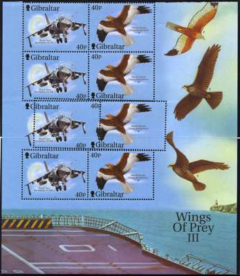 2001 Wings of Prey 40p Harriers part sheet of four pairs, the third pair with a badly misregistered perf strike, unmounted o.g. SG 982a