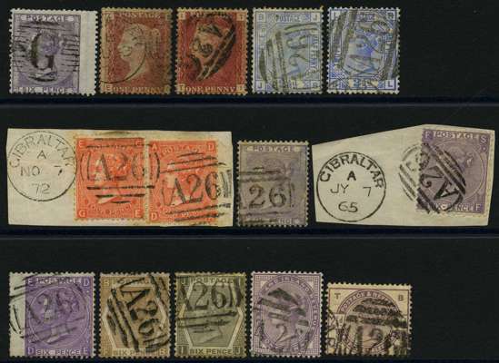 GB used in Gibraltar. 1856-84 small group of GB stamps (14) with Gibraltar postmarks, nothing exceptional but with two nice 4d vermilion Plate 12 on a piece, 1856 6d lilac, also Plate 5 and 9. Useful. SG Z11/80
