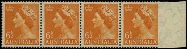 C of A Watermark: 1953-56 6½d orange horizontal strip of four, showing variety IMPERFORATE AT RIGHT (between far stamp and margin), fresh unmounted o.g.; a spectacular and very rare piece and desirable thus, illustrated in BW QEII 1952-55 ed 2012 pp 8/47. SG 263a,var; BW 298Aba