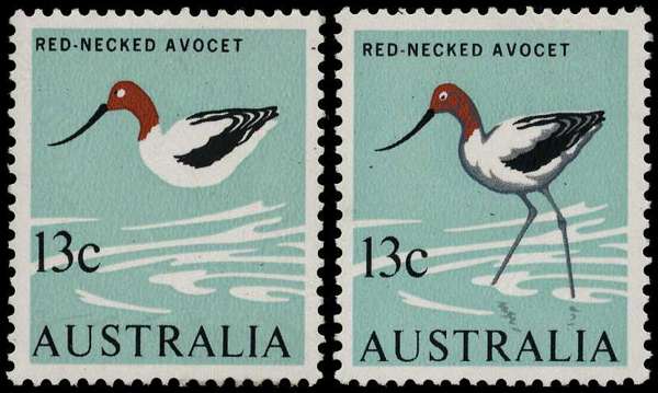 1966-73 13ct Red-necked Avocet, showing variety GREY (TAIL PLUMAGE and BRANCHES) OMITTED, fresh unmounted o.g., very fine and scarce, offered with normal for comparison. SG 392b; BW 454cc