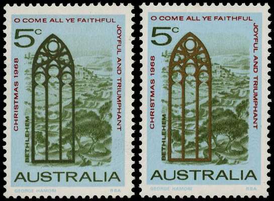 1968 Christmas 5ct showing variety GOLD OMITTED (GREEN WINDOW) OMITTED, full unmounted o.g., very fine, offered with normal for comparison. SG 431a; BW 494ca