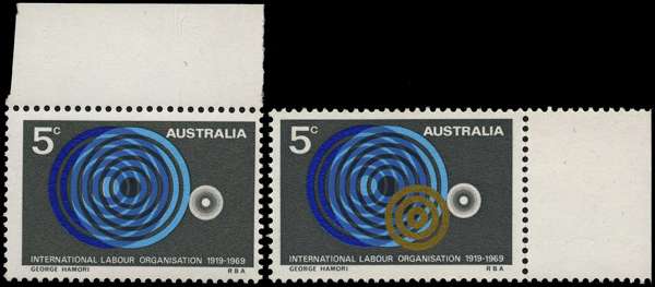 1969 50th Anniversary of Int'l Labour Organisation 5ct showing variety GOLD (MIDDLE CIRCLE) OMITTED, full unmounted, very fine and scarce, offered with normal for comparison. SG 439a; BW 502ca