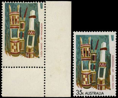 1971-74 Aboriginal Art 35ct Grave Posts lower right marginal showing variety BLACK (FACE VALUE & AUSTRALIA) OMITTED, full unmounted o.g., very fine and scarce, offered with normal for comparison. SG 497ab; BW 570c